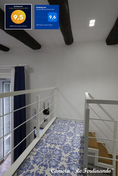 Die Suite „Re Ferdinando“ bietet Platz für 4 Personen (ein Doppelbett + zwei Zusatzbetten). Sie kann auch als Einzel-, Doppel- und/oder Familienzimmer gebucht werden. Die Sanitäranlagen (Bad und Dusche) befinden sich im oberen Teil des Zimmers, auf einem großen Zwischengeschoss. Im Zimmer befindet sich ein 42-Zoll-Farbfernseher, mit dem Sie neben den digitalen terrestrischen Kanälen auch alle ausländischen Kanäle der Plattform Hot Bird 13°Est empfangen können. Der Fernseher ist mit dem Internet verbunden und es ist auch möglich (wenn Sie einen eigenen Code haben), Netflix-Programme zu sehen.